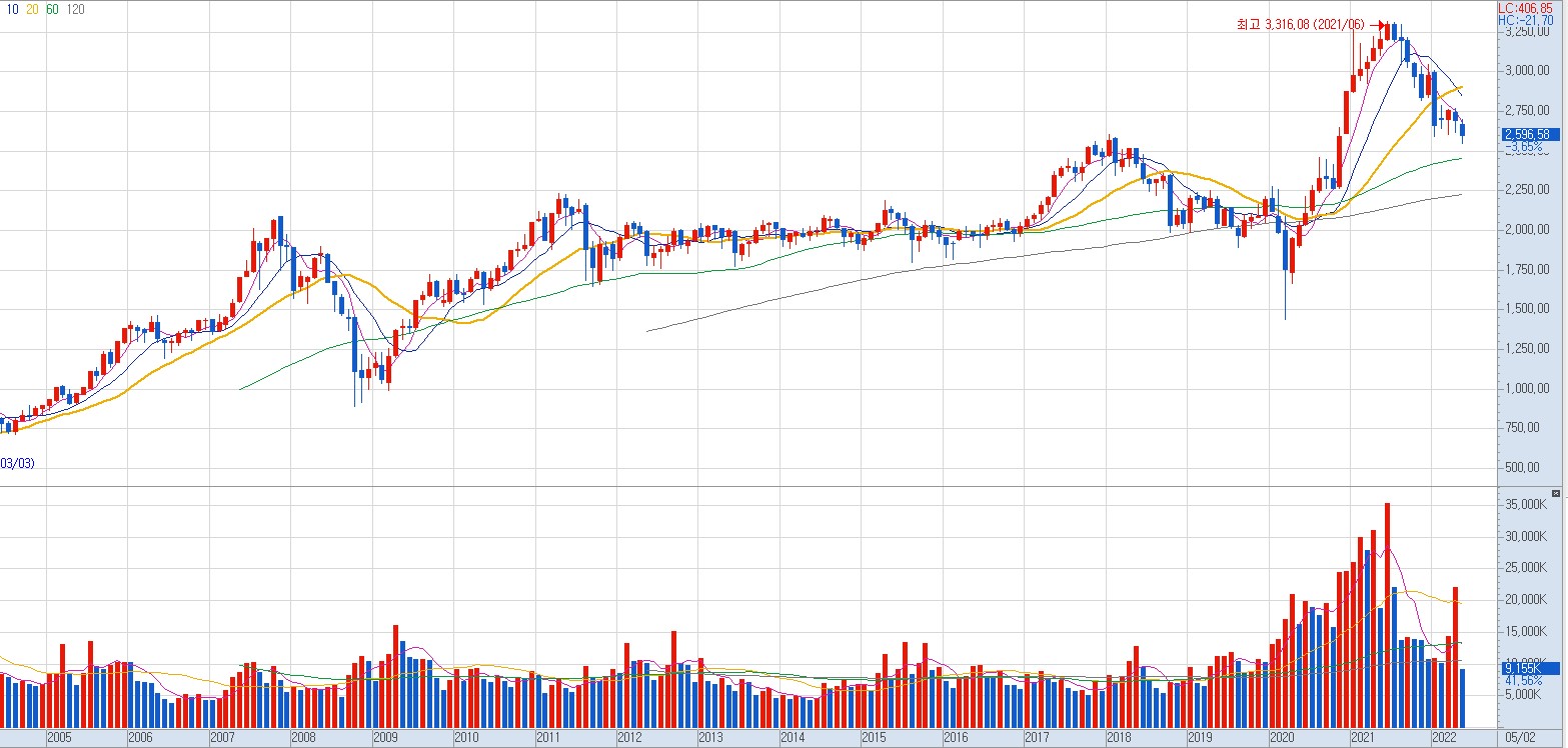 대충 제가 사회생활을 처음 시작했던 2005년부터 지금까지의 코스피입니다. 코스피 750에서 지금 2500까지 왔네요.