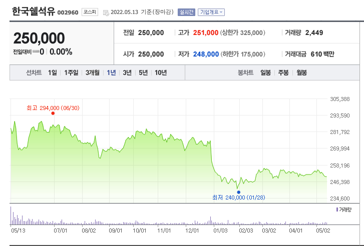 년중 최저가가 배당직후 배당락이었던 24만원에 근접한 25만원입니다.  최근 5년간 차트를 봐도 년중 최저가가 20만 3000원으로 거의 처저점에 근접해 있네요. (.. 애 무슨 일이 있나요?? 좀 살펴봐야 할 것 같습니다. 최근 10년간 차트를 열어봐도 최고가 60만원에서 꾸준히 하락해왔네요 )