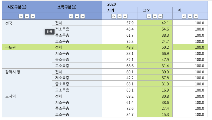 2020년 자료를 보면 수도권의 경우 자가외에 전월세를 사는 사람의 숫자가 전체의 50.2% 입니다.