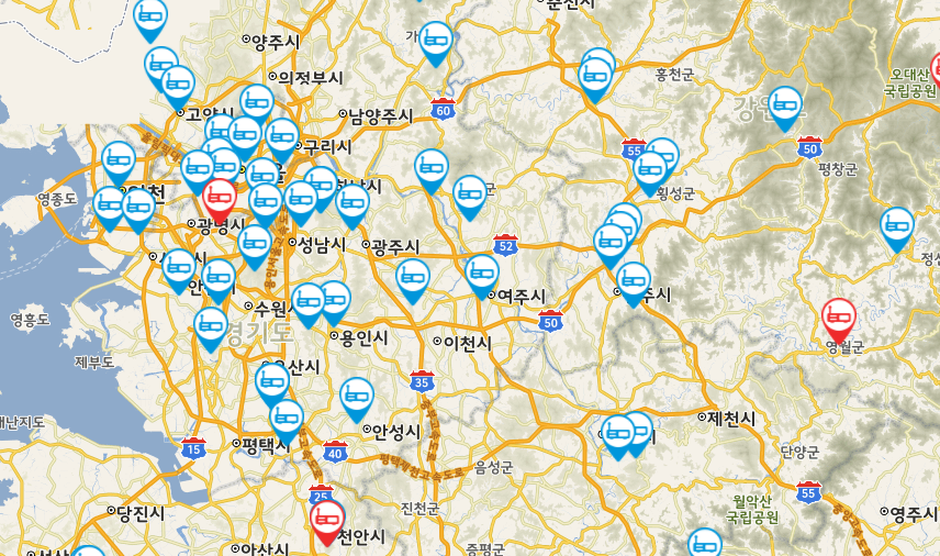 위 그림에서 빨간색은 광역 중계기이고 파란색은 지역 중계기이다. 지역 중계기는 해당 전파를 주변 지역으로만 뿌려주고, 빨간색은 전국 단위로 뿌려준다. 아마 광역 중계기 끼리는 인터넷이나 별도 라인을 통해서 연결이 되어 있을 것 같다.
